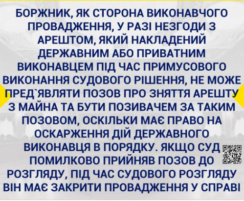 Итак, на основании указанного Верховный Суд в составе Объединенной палаты Кассационного гражданского суда пришел к выводу о том, что должник, как сторона исполнительного производства, в случае несогласия с арестом, который наложен государственным или частным исполнителем при принудительном исполнении судебного решения, не может предъявлять иск о снятии ареста с имущества и быть истцом по такому иску, поскольку имеет право на обжалование действий государственного исполнителя в порядке, предусмотренном разделом VII ГПК Украины. Если суд ошибочно принял иск к рассмотрению, в ходе судебного разбирательства он должен закрыть производство по делу по основанию, предусмотренному пунктом 1 части первой статьи 255 ГПК Украины.